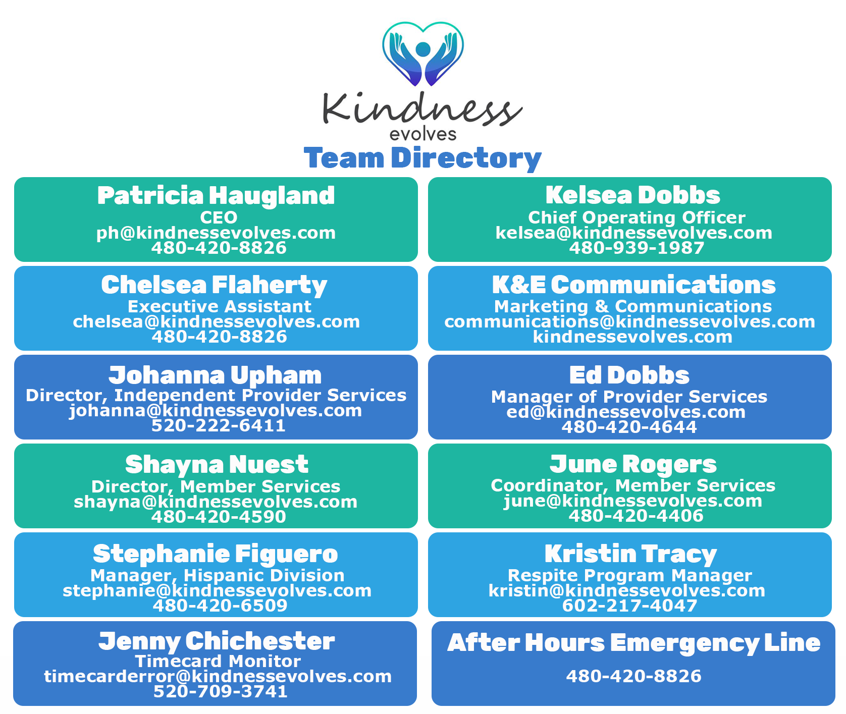 Our team leads with a smile and kindness as our core value. Founded in 2020, our team hit the ground running to work toward our common goal – to bring kindness, integrity and fun to the caregiving industry through providing respite, habilitation and attendant care to Arizonans who need it most. We take immense pride in helping our Kindness Evolves family and knowing that we are helping to make a difference in our community everyday. With expertise in business, caregiving, member services, program development and more, our team has exceptional skill and works tirelessly to achieve the best outcome for each individual and family we work with.